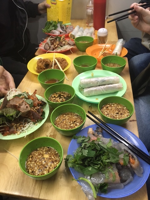 We stopped at a popular restaurant where the chef was stationed by the side of the road at his multi-faceted station with small tables and chairs in an open-air space behind him. Bach and Em ordered sliced beef salad with noodles, crispy fermented pork, glass noodle dumplings filled with chicken and chopped vegetables, and plates of spring rolls stuffed with cabbage, shrimp, and spring onions served with a fiery chili sauce. We could not stop praising the freshness of the food and its rich, compelling taste. When we finally stopped eating, there were only three spring rolls left to take home. Our two young guides tried to find a place where we could sample Pho, the traditional Vietnamese dish of beef, noodles, and herbs, but all of the restaurants were packed, and we settled on some dessert drinks. Bach and Em took us to Cong Caphe, a wildly popular coffee chain started by a teenager and sporting a Viet Cong theme complete with a 1960’s military motif. A specialty was coconut coffee, one of the most flavorful and sumptuous beverages I’ve had the pleasure of consuming.